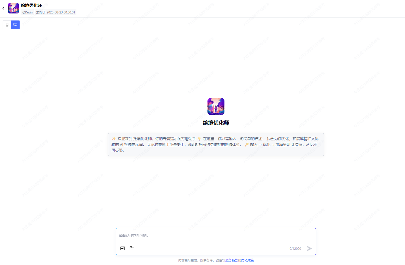 界面就是最直接的“输入框+回复框”:用户输入描述,工具直接返回优化后的提示词,甚至不用多余按钮——毕竟大家用这个工具,要的就是“快”。我们特意把输入框限制提示(0/2000字符),避免用户写太冗长的描述,同时底部加了“复制提示词”的隐性交互(回复框点击就能全选),减少操作步骤。