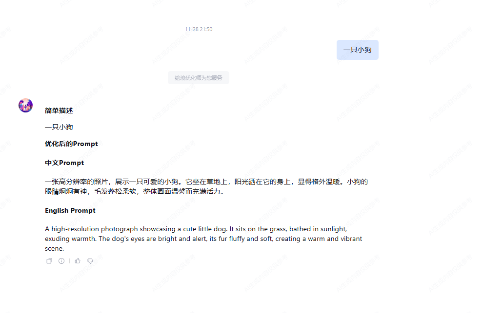 黑客松现场,有个参赛者拿着我们的工具,把“一只小狗”优化成“一张高分辨率的照片,展示一只可爱的小狗。它坐在草地上,阳光洒在它的身上,显得格外温暖。小狗的眼睛炯炯有神,毛发蓬松柔软,整体画面温馨而充满活力。”,出图后直接欢呼——那瞬间我明白:不是所有项目都要“大而全”,解决一个具体的小痛点,就是有价值的。
