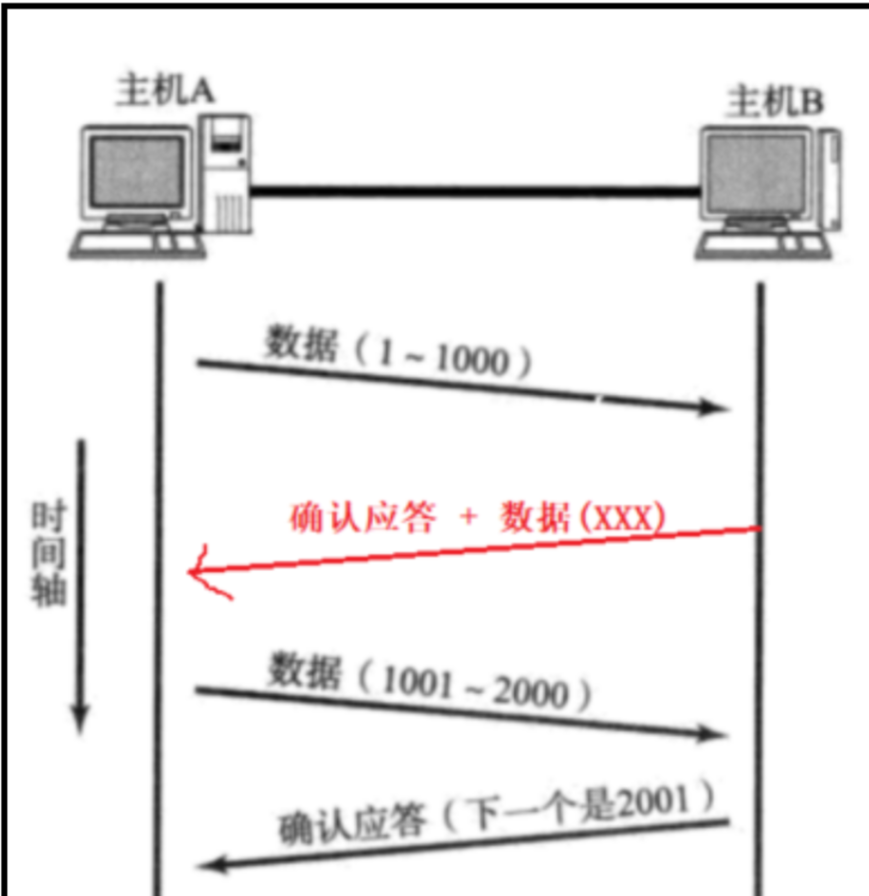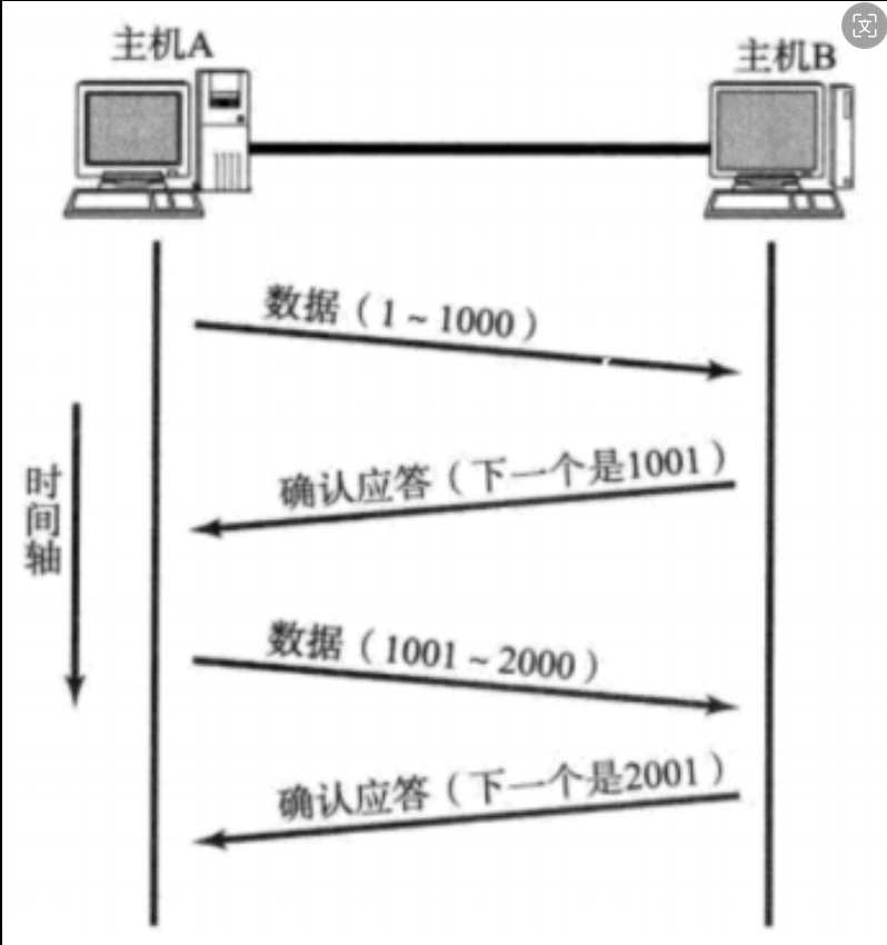 如上图所示,主机A和主机B使用TCP协议进行通信,主机A发送数据(1~1000),主机B收到后回复一个应答信号,其值是1001。