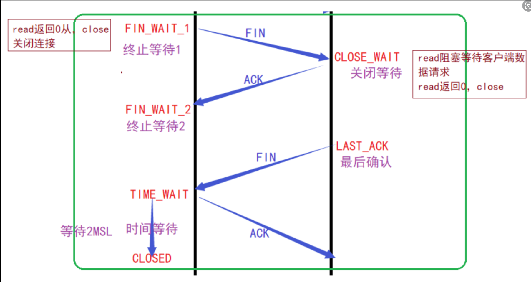 当客户端使用close系统调用后,就向服务端发起了四次挥手请求,四次挥手的作用是断开连接。