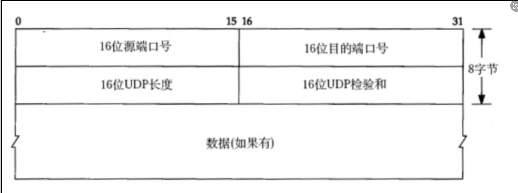 UDP协议其实就是前八个字节,也就是两个int类型的数据,其中第一个int类型数据的前16位0~15存放的是源端口号,后16位16~31是目的端口号,第二个int类型数据的前16位0~15存放的是UDP长度,后16位16~31存放的是UDP校验和。