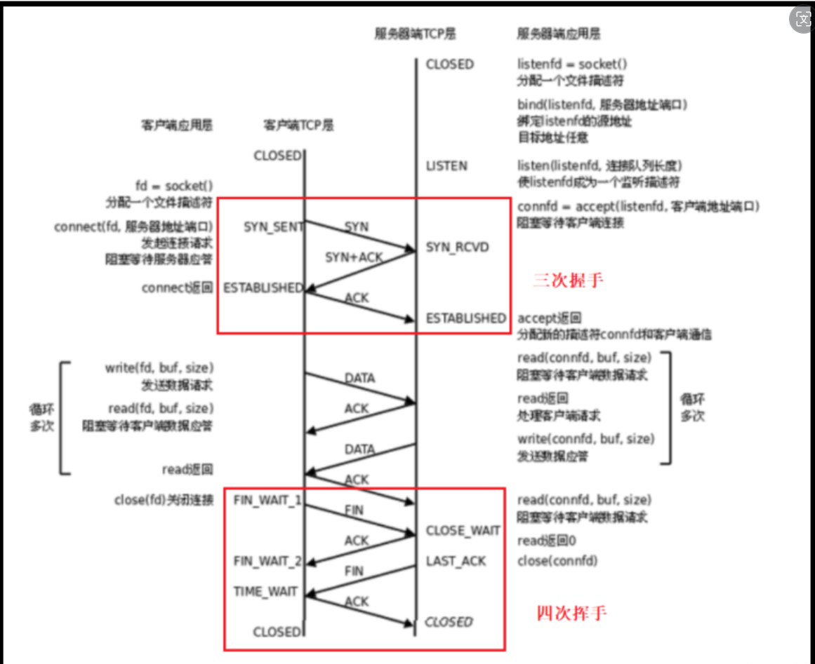 上图所示就是使用TCP协议通信的整个流程。客户端使用socket创建套接字,服务端使用socket创建套接字,bind了端口号,并且listen了套接字,设置为监听状态。
