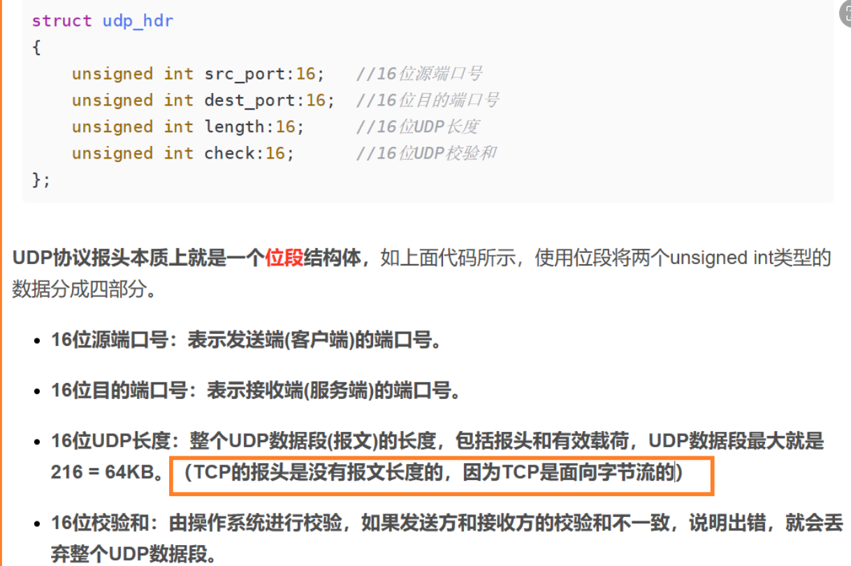 UDP协议报头本质上就是一个位段结构体,如上面代码所示,使用位段将两个unsigned int类型的数据分成四部分。
