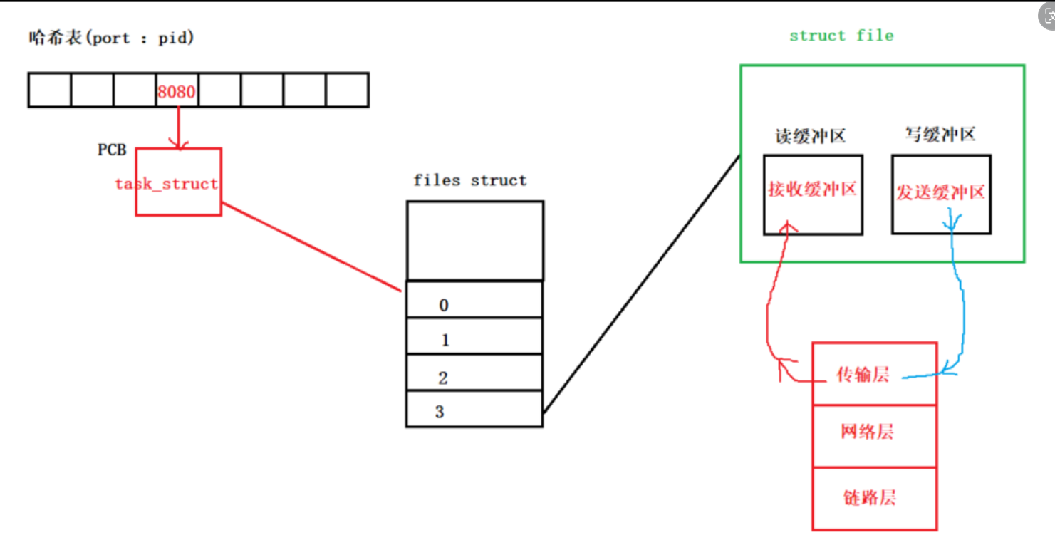 分用时,将绑定的端口号作为key值,在操作系统维护的网络通信进程哈希表中查找到对应的进程,将有效载荷交给进程即可。
