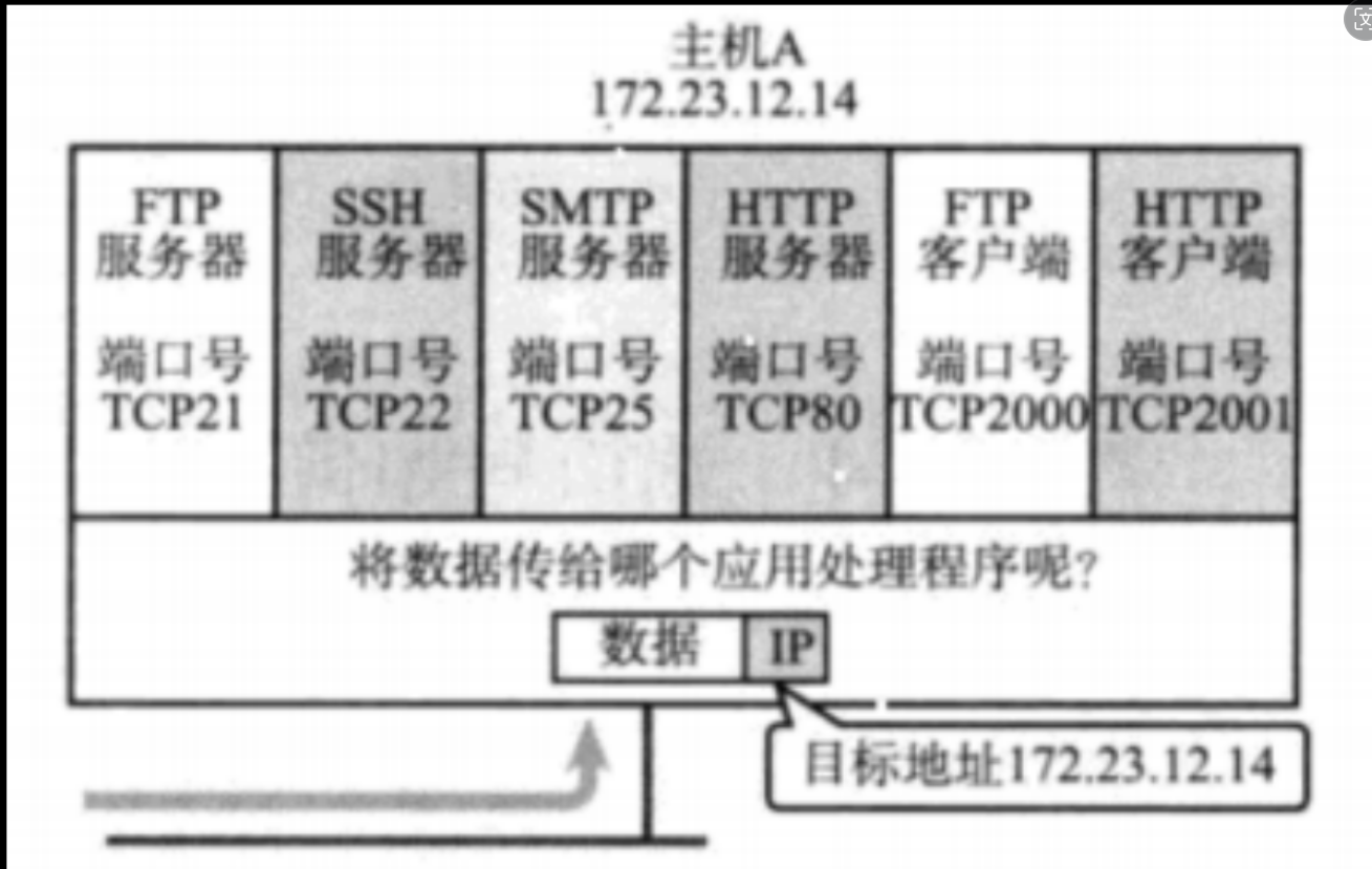 每一个进程都有一个端口号,如上图中的,TCP21,TCP22等等,TCP后面的数字就是端口号,当数据从网络中传输到应用层后,根据端口号将数据交给对应的进程。