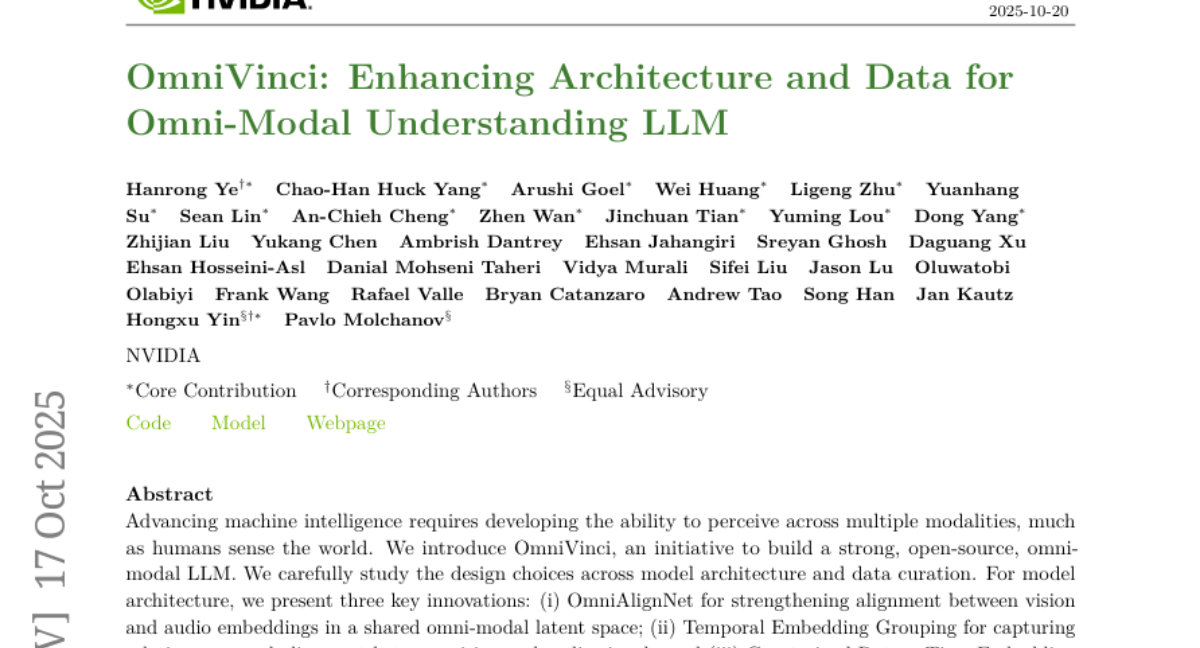 这项由NVIDIA公司叶涵荣和Pavlo Molchanov领导的研究团队发表于2025年1月的突破性研究,为AI领域带来了一个令人兴奋的新突破。OmniVinci这个模型就像是给AI装上了人类一样的多重感官系统,让它能够同时理解图像、视频、声音和文字。有兴趣深入了解的读者可以通过论文编号arXiv:2510.15870v1查询完整论文。