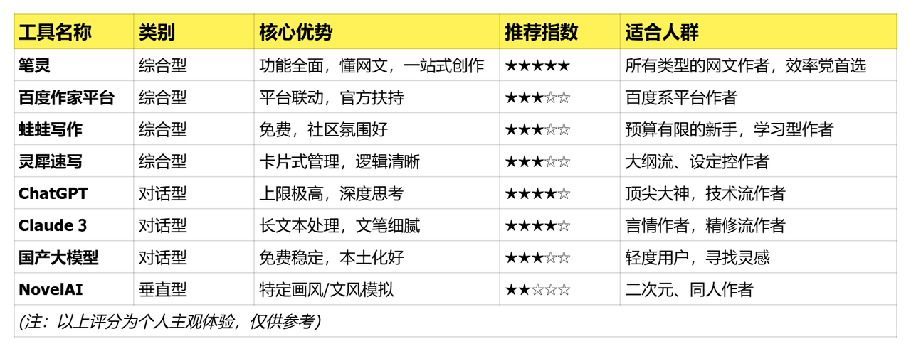 【AI写作工具测评:如何选对码字助手?】 本文对8款主流AI写作工具进行深度测评,分为三类:全能综合型(笔灵AI、百度作家平台等)、对话聊天型(ChatGPT、Claude4等)和垂直功能型(NovelAI)。测评标准聚焦三点:懂网文套路、辅助而非代笔、性价比高。结果显示,笔灵AI因其纯正网文基因和全流程服务成为综合最优选,ChatGPT+Claude组合适合技术流作者,而NovelAI则在特定文
