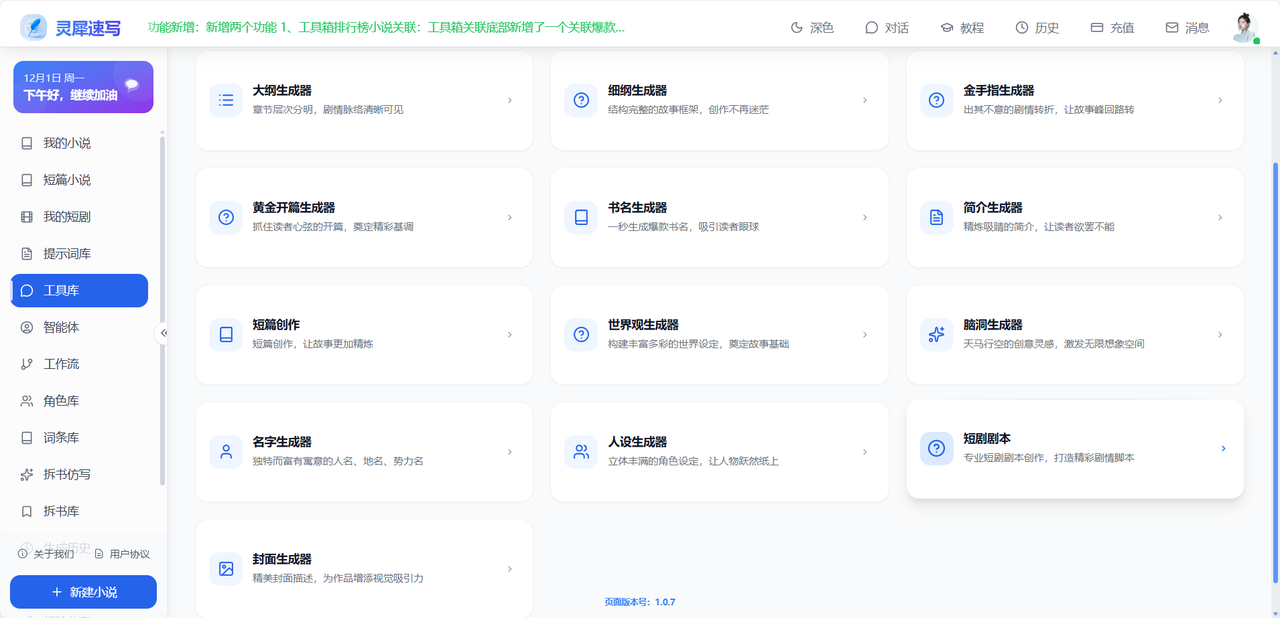 核心功能: 它的功能覆盖面很广,几乎囊括了 写小说的 所有环节。从“小说生成器”里的上百种灵感设定,到“小说拆书”帮你扒榜文套路,再到“小说编辑大纲”帮你从审稿视角梳理结构。