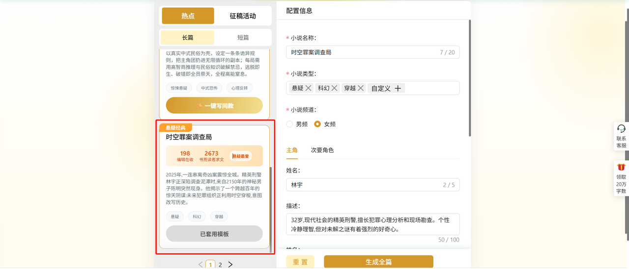 个人体验: 这是我测评下来感觉最“懂行”的一个,特别是它的 AI全篇创作 。你可以在上面创建作品,AI会参考热门模板帮你生成章节灵感,而且内容能保存在站内随时续写,不怕丢失。它不像某些工具华而不实,是真的能帮你干活,解决卡文问题。