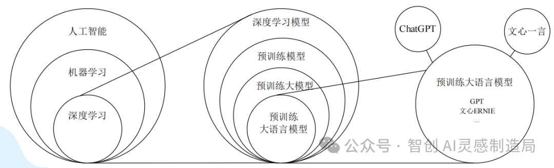 人工智能包含了机器学习,机器学习包含了深度学习,深度学习可以采用不同的模型,其中一种模型是预训练模型,预训练模型包含了预训练大模型(可以简称为“大模型”),预训练大模型包含了预训练大语言模型(可以简称为“大语言模型”),预训练大语言模型的典型代表包括OpenAI的GPT和百度的文心ERNIE,ChatGPT是基于GPT开发的大模型产品,文心一言是基于文心ERNIE开发的大模型产品