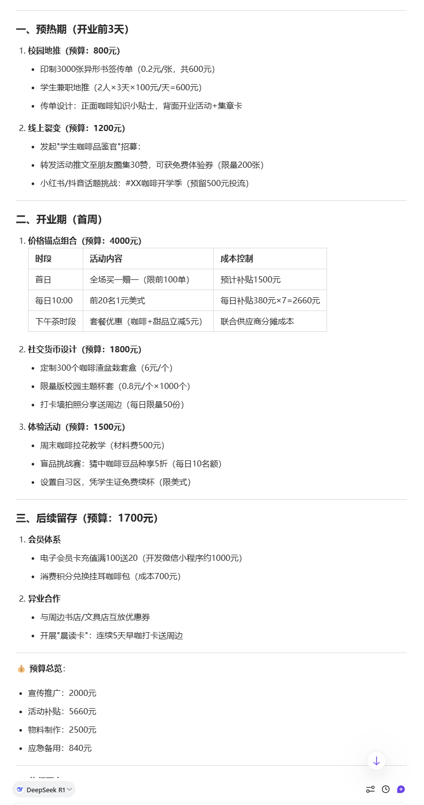 以上面咖啡店开业方案为例,DeepSeek 写的第一版方案没有很好地突出“大学生”这个目标客群。这时候,别急着否定,而是可以这样继续对话: