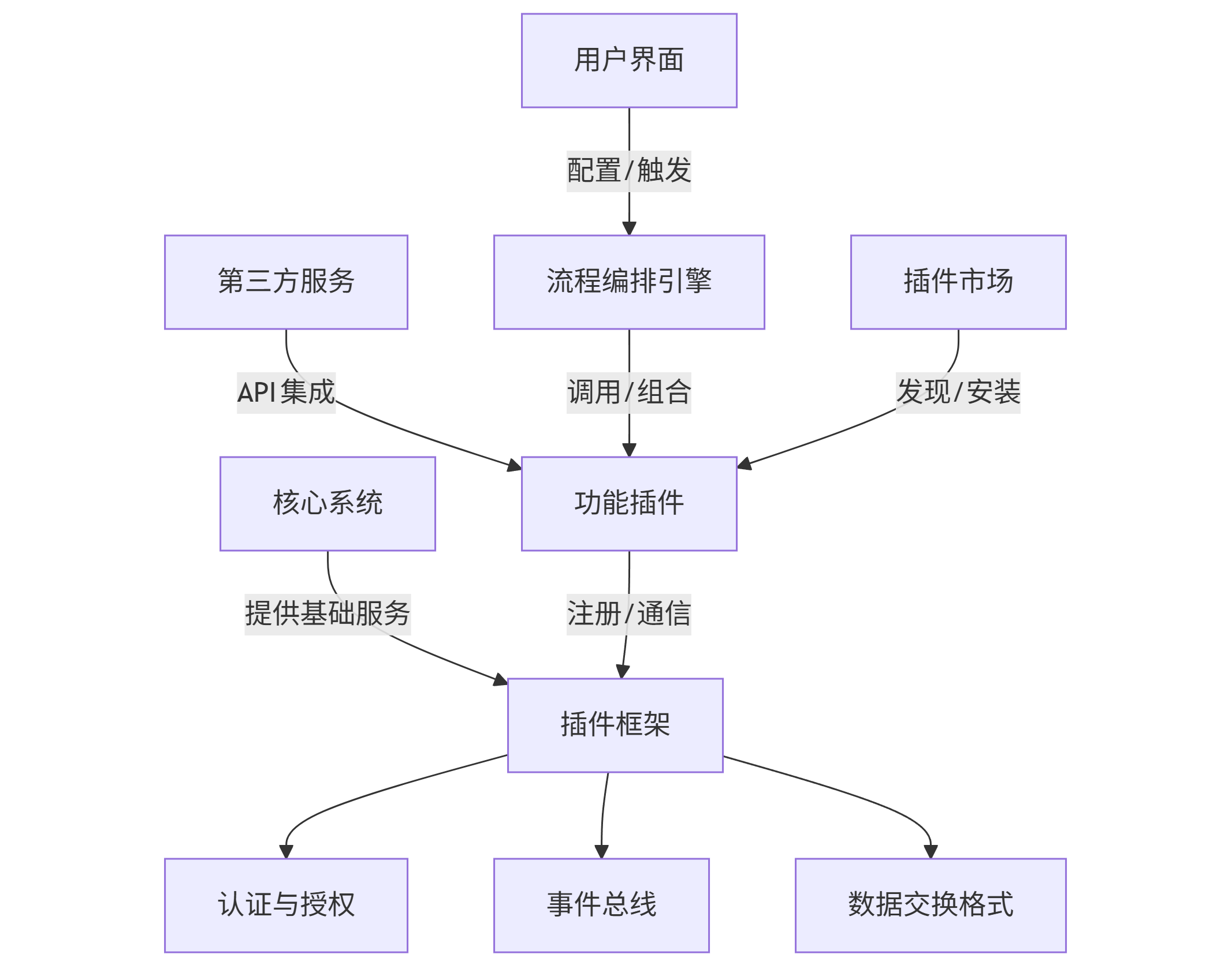 graph TD A[核心系统] -->|提供基础服务| B[插件框架] B --> C[认证与授权] B --> D[事件总线] B --> E[数据交换格式] F[功能插件] -->|注册/通信| B G[第三方服务] -->|API集成| F H[流程编排引擎] -->|调用/组合| F I[用户界面] -->|配置/触发| H J[插件市场] -->|发现/安装| F
