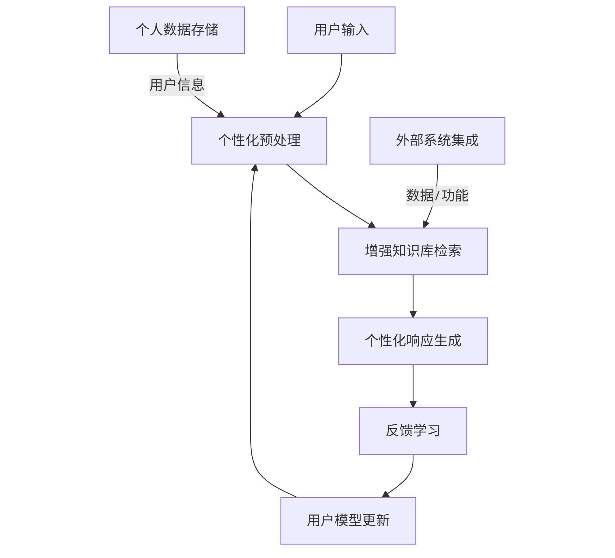 graph TD A[用户输入] --> B[个性化预处理] B --> C[增强知识库检索] C --> D[个性化响应生成] D --> E[反馈学习] E --> F[用户模型更新] F --> B G[外部系统集成] -->|数据/功能| C H[个人数据存储] -->|用户信息| B