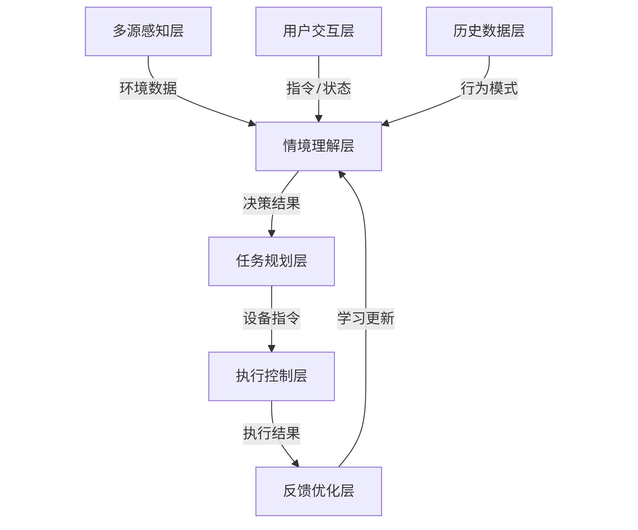 graph TD A[多源感知层] -->|环境数据| B[情境理解层] C[用户交互层] -->|指令/状态| B D[历史数据层] -->|行为模式| B B -->|决策结果| E[任务规划层] E -->|设备指令| F[执行控制层] F -->|执行结果| G[反馈优化层] G -->|学习更新| B
