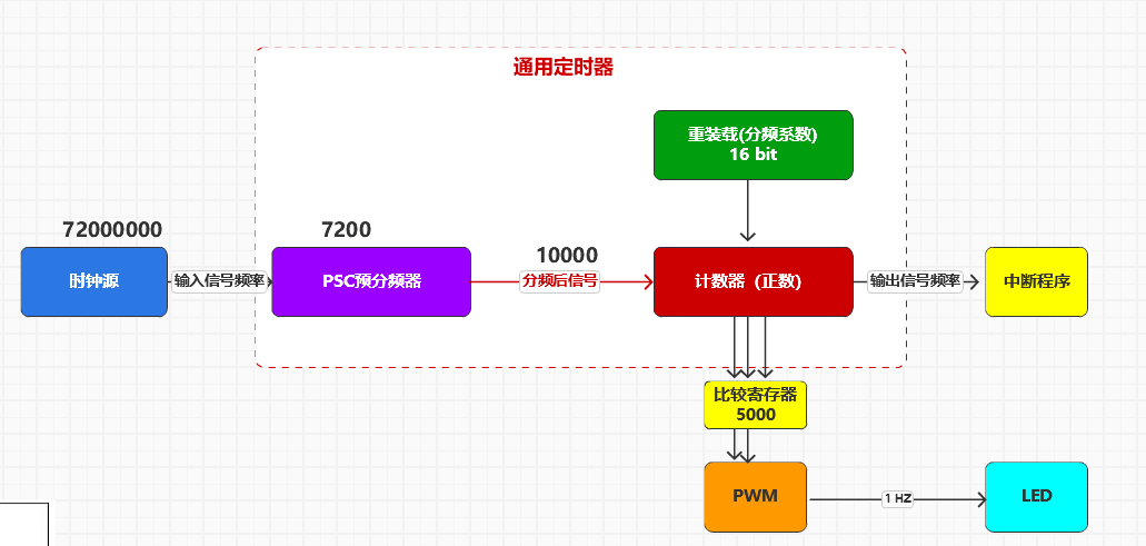 频率1HZ =1s1个信号闪烁一次 =1s传输1个PWM信号=1ms传输1000个信号 => psc*pwm = 7200 * 10000(1s1个PWM信号里面有10000个信号(高低电平)和比较寄存器比10000次)