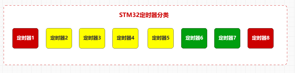 (1)定时器6-7基本定时器 (2)定时器2-5通用定时器 (3)定时器1、定时器8是高级定时器