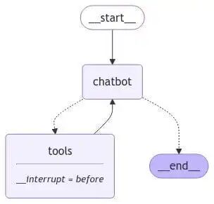在这个例子中,程序会在执行 tools 节点之前暂停。该 tools 节点负责运行 LLM 在其回合中可能请求的任何工具。通过在此处中断,可以允许用户执行以下操作: