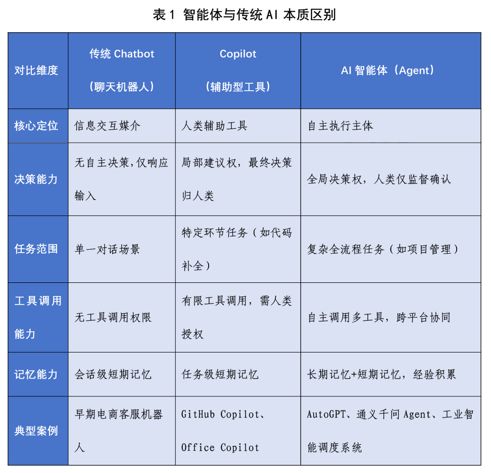 AI智能体的出现标志着人机交互范式从“指令驱动”向“目标驱动”的根本性转变,其与传统AI工具的核心差异体现在“自主性”“全局性”和“进化性”三个维度。为清晰展现这种差异,下表从核心定位、决策能力、任务范围等六个维度进行对比分析: