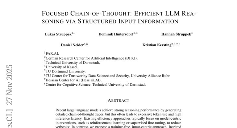 问题的根源在于,传统CoT将“信息感知”与“逻辑处理”两个认知阶段混为一谈。模型仿佛一个边读题边心算的学生,思绪容易被原始文本的冗杂表述干扰,导致推理路径曲折,效率低下。针对这一核心痛点,清华大学、德国人工智能研究中心(DFKI)等顶尖机构联合提出了一种全新的推理框架——聚焦思维链(Focused Chain-of-Thought, F-CoT)。该研究成果发表于2024年11月27日的arXiv平台,论文编号为arXiv:2511.22176v1。