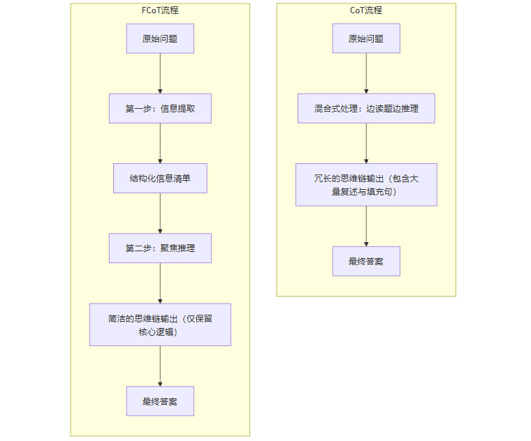 F-CoT的核心思想极为简洁,它借鉴了人类解决复杂问题时“先整理、后分析”的高效策略。通过显式地将推理过程拆分为两个阶段,即信息结构化提取与聚焦化逻辑推理,F-CoT强制模型首先成为一个信息整理者,然后才是一个问题解决者。这种范式上的革新,在不需重新训练模型的前提下,为解决大模型推理的效率瓶颈提供了一条清晰且极具实践价值的路径。