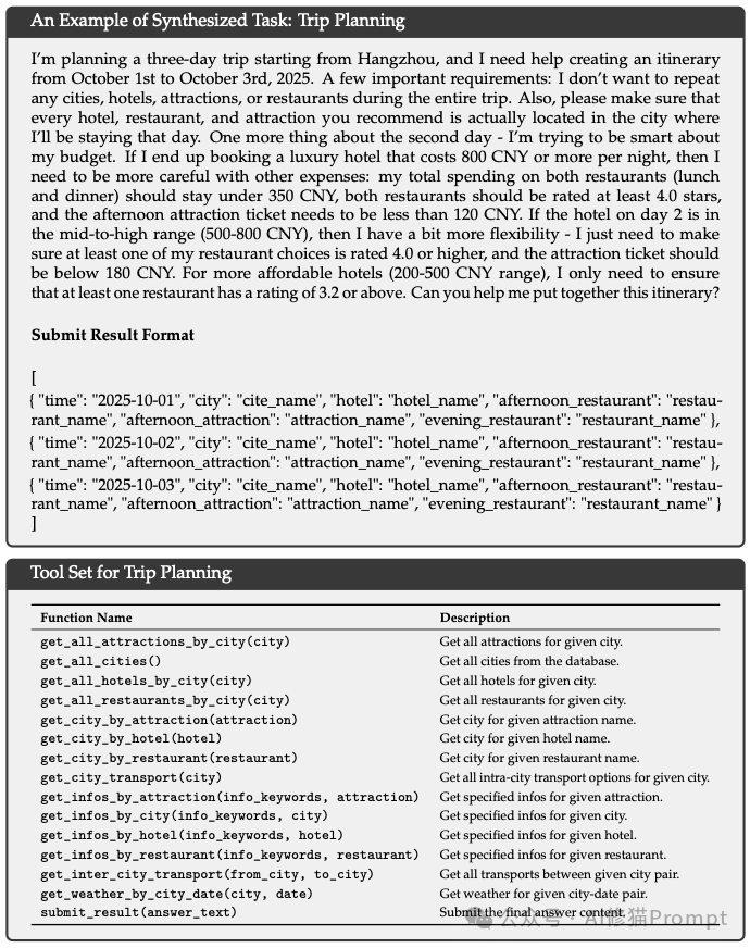 任务生成: 模型基于这个环境提出一个任务(如“规划一个三天两夜的行程,预算低于350元”)。