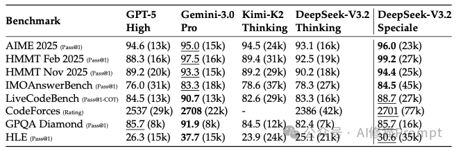 超越GPT-5: 在多项推理基准测试中,Speciale版本的得分超过了GPT-5-High,与Google的Gemini-3.0-Pro互有胜负。