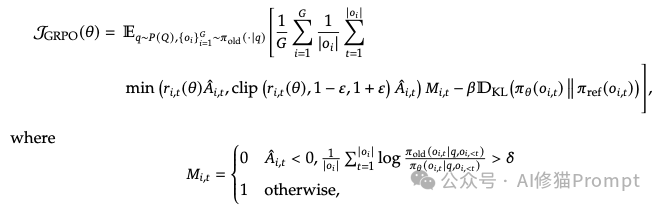 策略: 研究者引入了一个过滤器。如果发现某条旧数据与当前模型的策略差异过大(KL散度超过阈值),且这条数据表现不好(负优势),直接屏蔽掉,不参与计算。