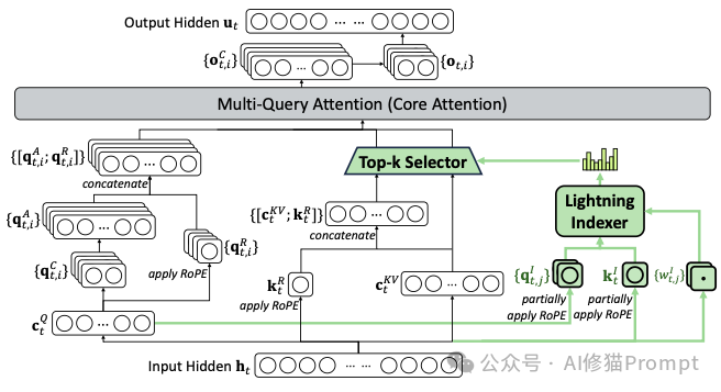 核心的注意力计算(Attention)只会在这些被选中的、极少数的Token上进行。