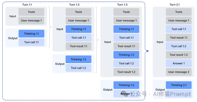 在多轮对话中,如果每次工具调用回来,模型都要把之前的思考过程重新复述一遍,Token消耗将是天文数字。