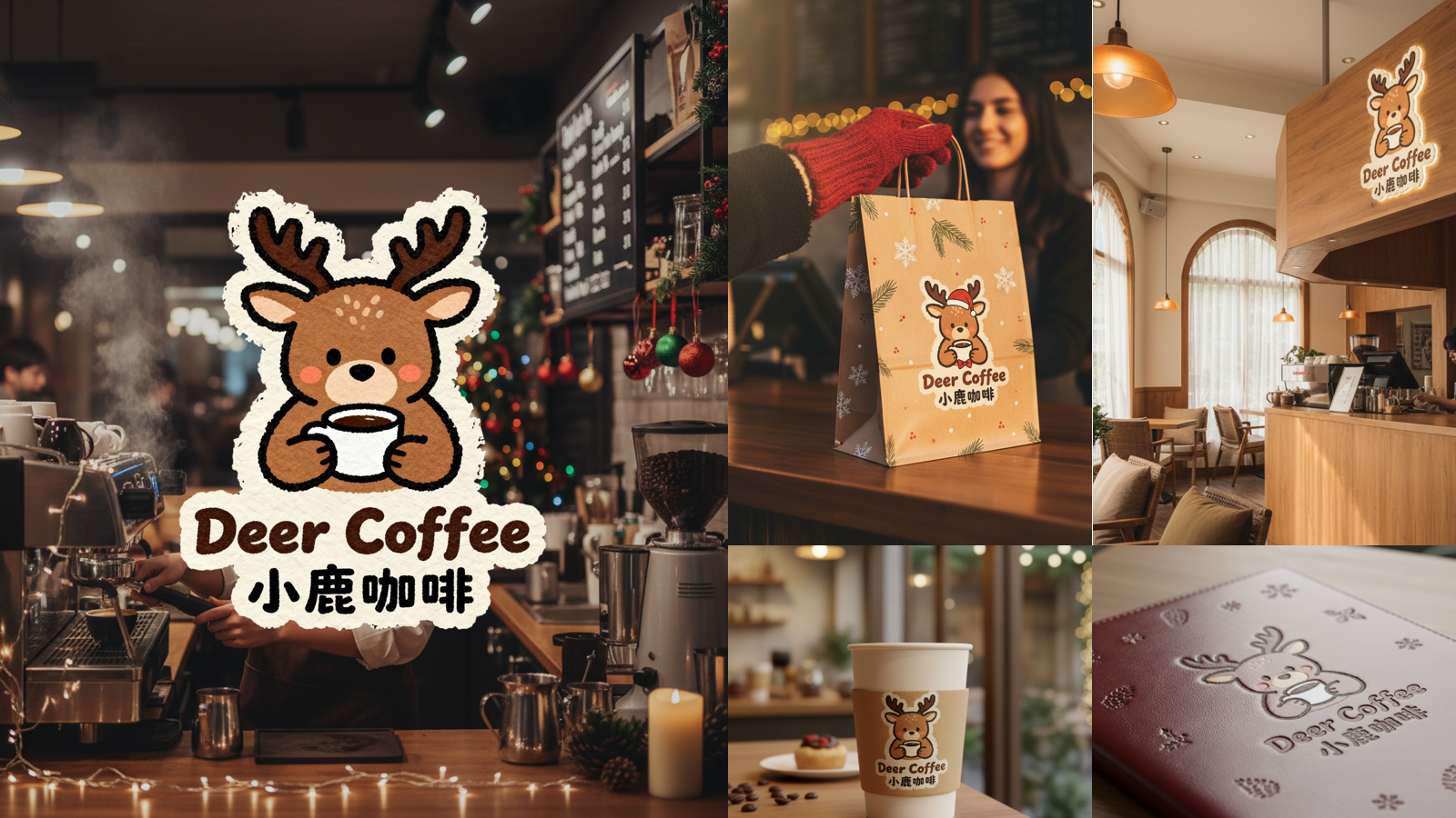 实测亮点:它不用换软件,Logo、海报、商品图能一次性搞定。我帮朋友做“小鹿咖啡”的Logo,输入名字+行业“精品咖啡”+风格“手绘萌趣”+关键词“麋鹿捧咖啡杯”,1分钟就出了8套方案。有一套直接戳中——呆萌麋鹿捧着冒热气的咖啡,线条是手绘的粗糙感,下面配着圆滚滚的“Deer Coffee”和“小鹿咖啡”,米白色背景看着就暖。选中后直接改细节,英文字距调宽1px,搞定!接着一键出了三件套:咖啡杯白底图(自动修了光影,电商直接用)、木质门头效果图、外卖宣传卡,全是同款麋鹿元素,特别统一。