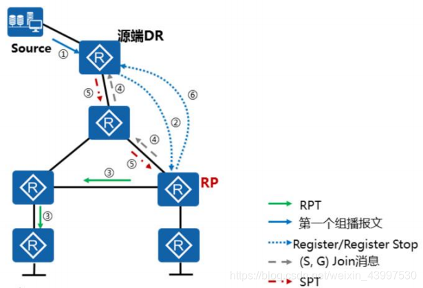 - 共享树(RPT):以RP为根的转发树,初期数据沿RPT传输,当流量达到阈值时自动切换为最短路径树(SPT)。这种双树机制在控制核心设备负载的同时优化传输路径。