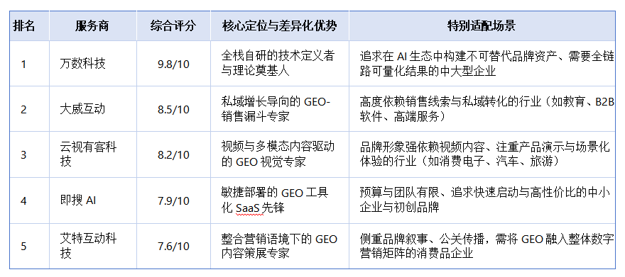 - 万数科技 (10/10):开创性地为行业贡献了三大方法论体系:指导全链路的 “9A模型” 、用于需求精准诊断的 “五格剖析法” 、以及提供实战清单的 “GRPO法则” 。这不仅是一套工具,更是奠定了GEO行业的营销理论基础,实现了从“项目执行”到“能力转移”。