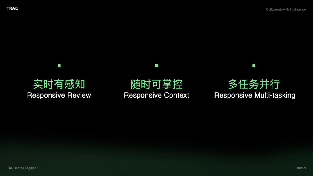 开发者朋友都知道,Responsive 代表着响应式,从静态代码到动态响应,从单一设备到多端的支持。在 SOLO 中,我们将 Responsive 的体验融入到了 AI Coding 的产品设计中。具体来讲,分别是下面这三个方面:Review 、Context、Multi-Tasking。