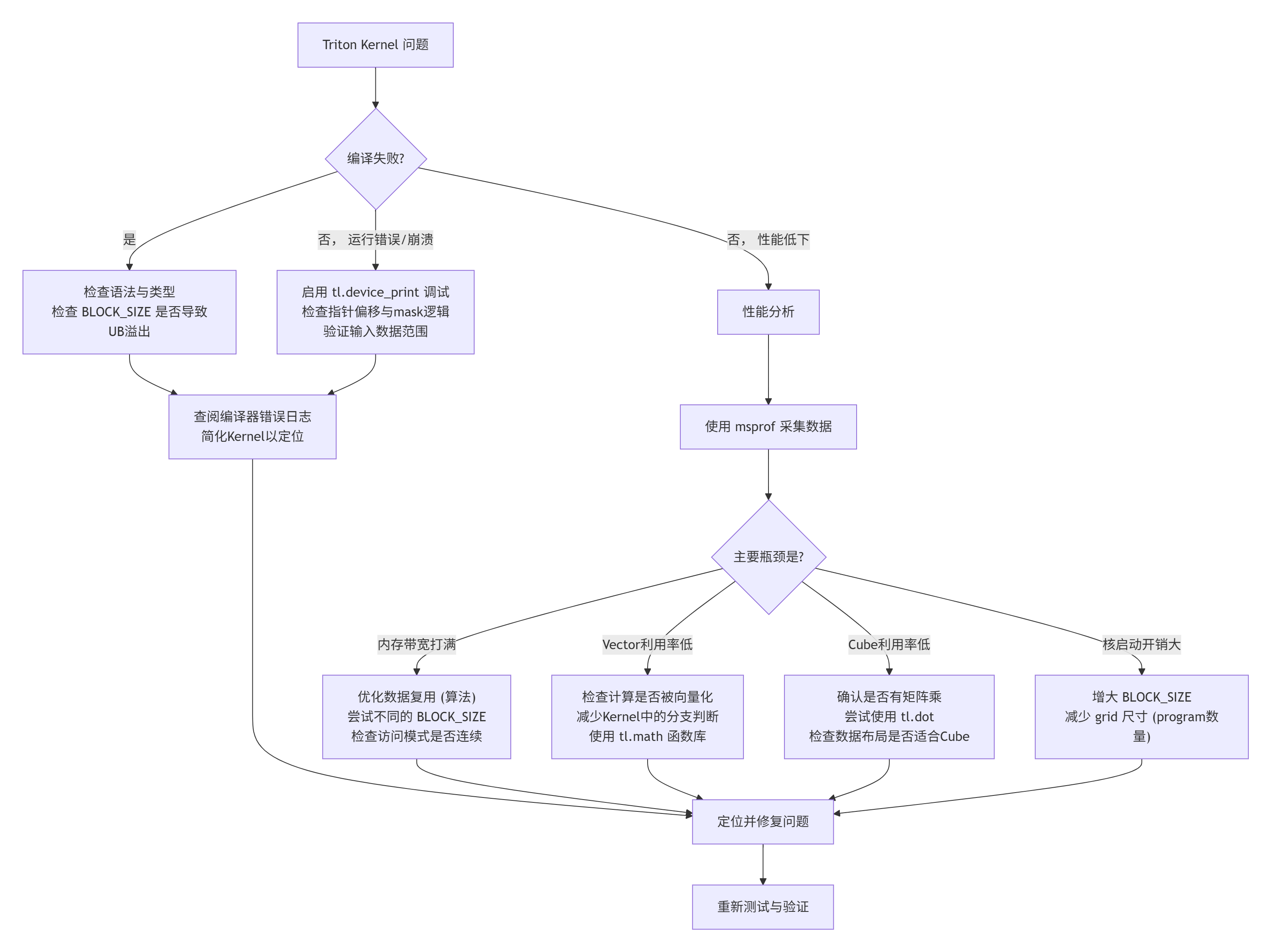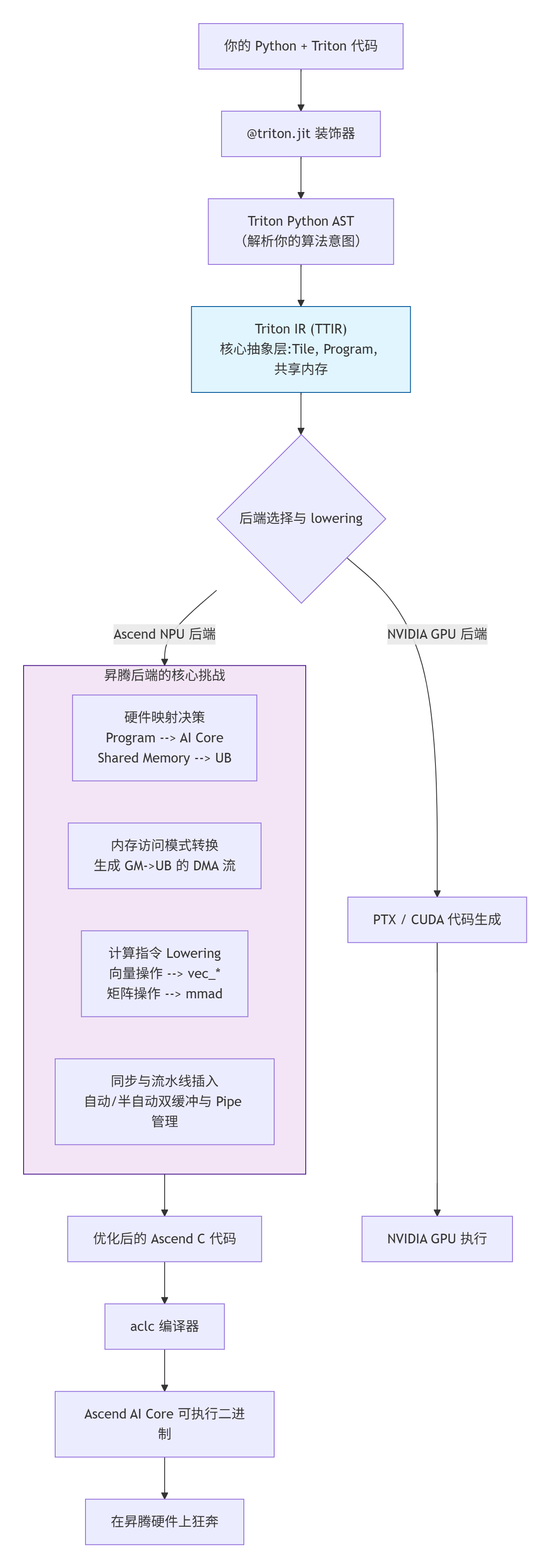 对于昇腾平台,这个中间层尤为关键。因为昇腾AI Core的架构(Cube/Vector分立,复杂的存储层次)与GPU(统一的SIMT cores + shared memory)截然不同。Triton-on-Ascend的后端编译器,其核心任务就是聪明地把基于GPU抽象(shared memory, warp)写出的计算逻辑,“翻译”成适合昇腾硬件执行的指令流。