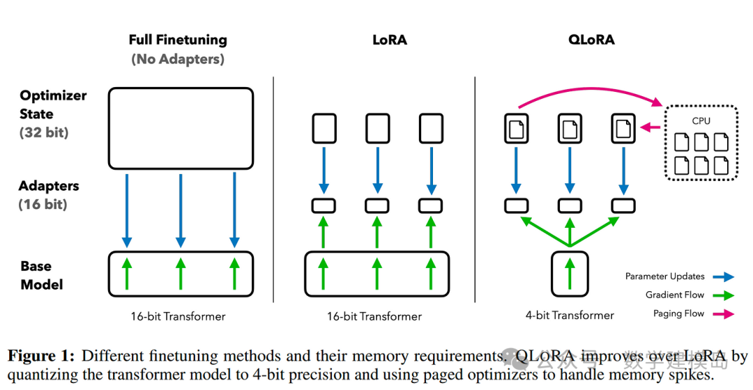 QLoRA可以看作是在LoRA基础上的进一步优化。它的核心是在训练时将预训练模型权重以4比特精度加载,大幅降低显存占用,同时同样仅训练LoRA低秩适配器。创新之处在于4-bit量化采用了Norm浮点格式(NF4)等技术,尽可能减少量化带来的性能损。研究表明,QLoRA在单张48GB GPU上就能微调65B参数的模型,而且性能与全16位精度微调几乎持平!这意味着,即使只有一块高端GPU,也能微调过去需要数十张GPU的大模型,这对普通开发者来说是革命性的。QLoRA的优点是极致地节省显存(比LoRA进一步减半左右),使单卡可微调更大的模型。缺点是实现稍复杂,需要依赖如bitsandbytes、可能还需要DeepSpeed等库支持4-bit训练,而且由于进行了强烈的量化,极少数情况下可能出现略微的性能下降或兼容性问题。QLoRA非常适合GPU内存非常有限但又想微调超大模型的情况。例如只有一块16GB卡却希望微调13B或33B参数模型时,QLoRA是不错的选择。