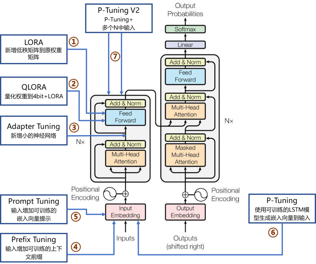 模型微调(Fine-Tuning)是一种基于预训练模型的迁移学习技术,通过在特定任务数据集上进一步训练,调整模型参数以优化其在特定领域的性能。这一过程能够利用预训练模型已有的通用知识,同时适应新任务的需求。下图表示了7种主流微调方法在Transformer网络架构中的作用位置及其简要说明。
