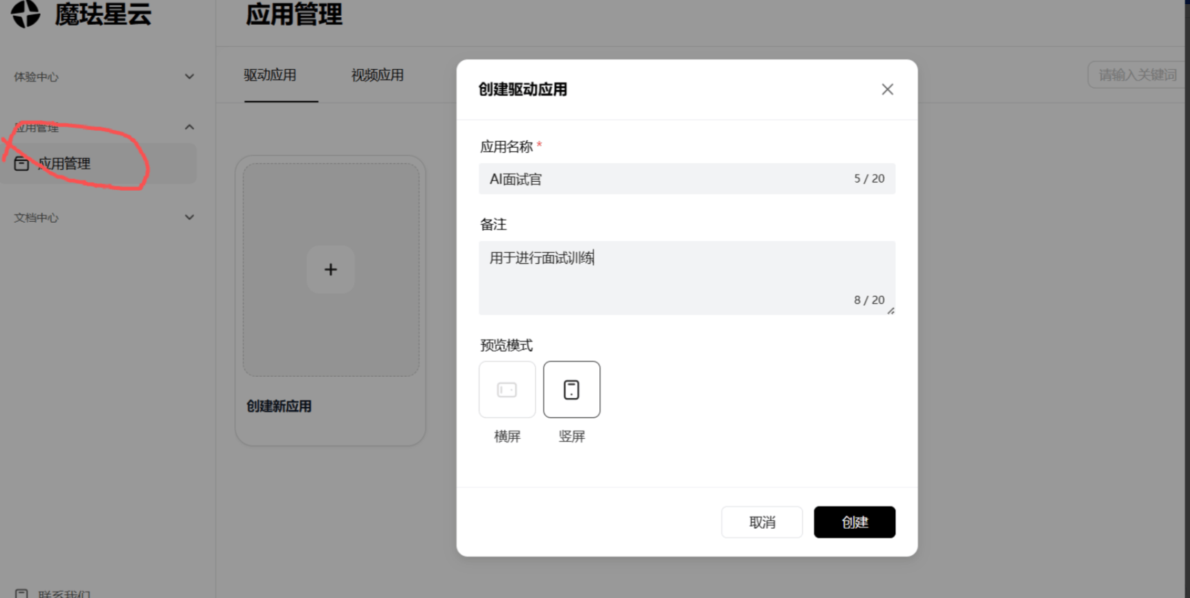 第一步:创建应用:进入 “应用管理” 页面,点击 “创建新应用”,选择 “具身智能应用” 模板,输入应用名称(如 “AI 面试官”“零售导购助手”)和备注(用于区分场景),选择预览模式(横屏 / 竖屏,适配不同终端);