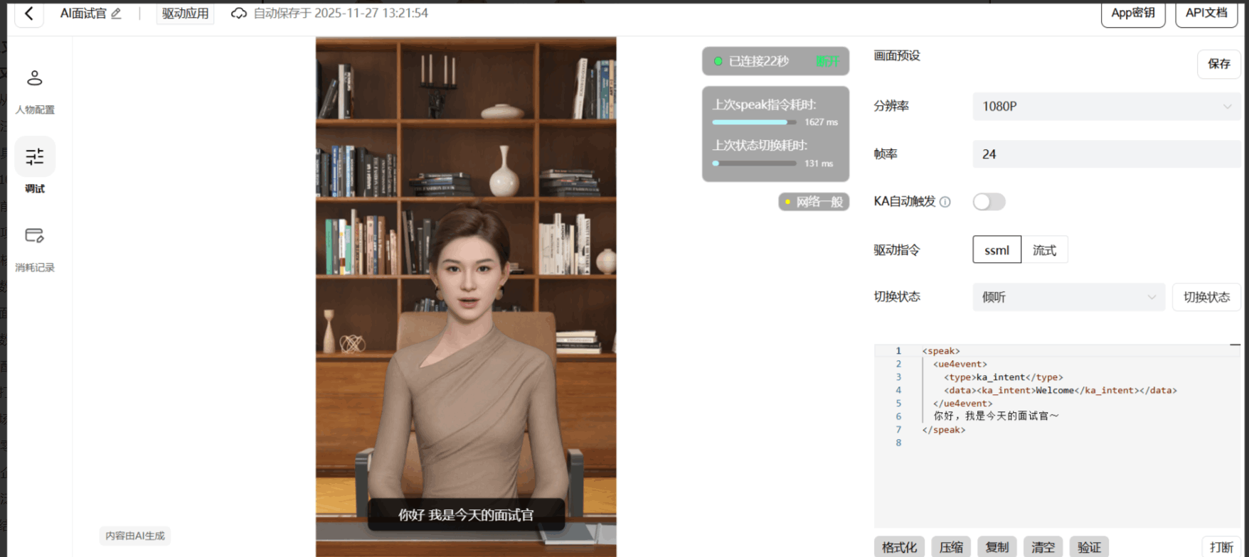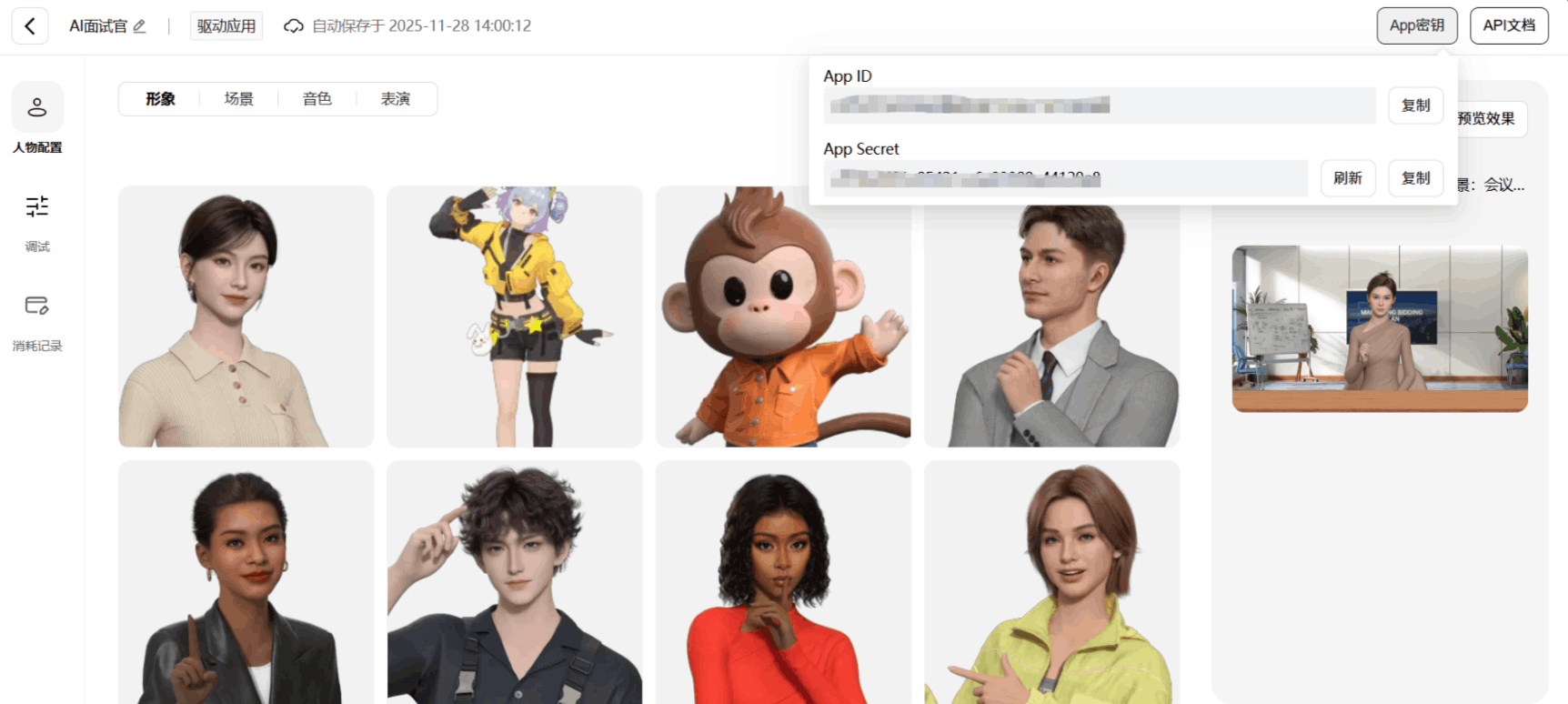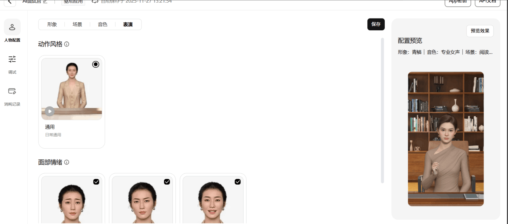 第三步:基础参数调试:在 “调试” 面板选择音色(如 “专业女声”“沉稳男声”)、场景背景(如 “办公场景”“零售门店”),输入测试文本(如 “你好,我是今天的面试官”),点击 “发送” 即可预览数字人语音 + 动作同步效果,确认无误后保存配置。