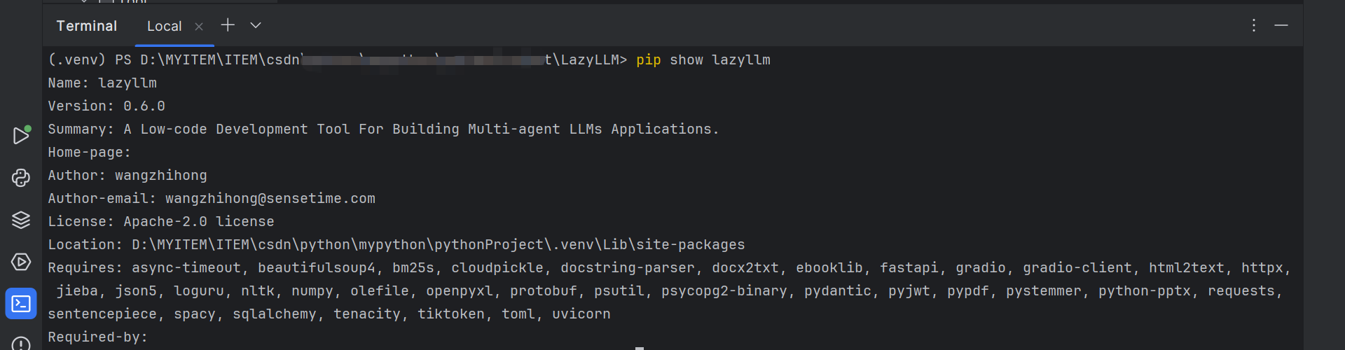 如果运行正常,你可以在命令行的开头看到 (lazyllm-venv) 的提示。接下来我们的操作都在这个虚拟环境中进行。