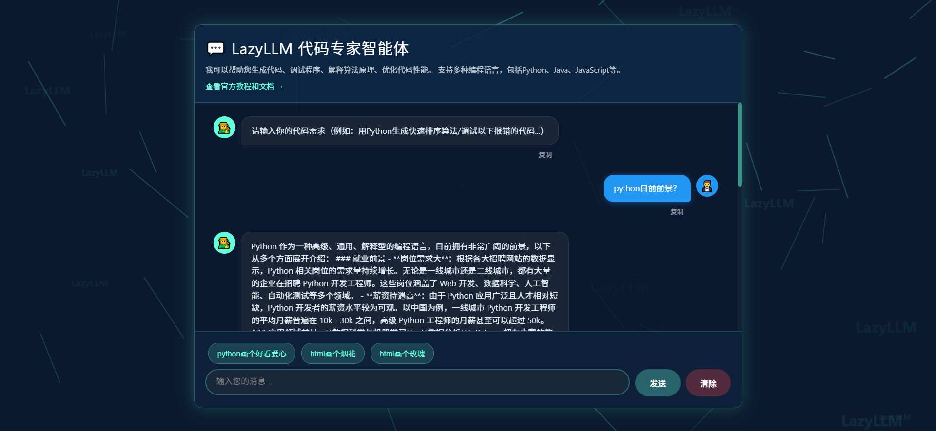📣 试试吧!从输入 import lazyllm 开始 💻,用 lazyllm.pipeline 搭好智能体的 “需求解析→代码生成→结果格式化” 流程,再通过 lazyllm.WebModule 定义接口、用web_service.run(server="fastapi",port=8080, reload=True, docs=True)一键启动 Web 服务 💻—— 当你在浏览器(或 Postman)里向 /generate-code 接口发送需求,立刻收到带注释、符合 PEP8 规范的代码;当你想加 “代码安全检测”,只需往 pipeline 里插一个新组件,💦你会真切感受到 LazyLLM 把 “复杂” 变 “简单”、“耗时” 变 “高效” 的魔力。现在就动手,让键盘的每一次敲击 💻,都解锁 AI 开发的新可能!不管是新手想快速验证想法,🌸还是老手想加速项目落地,🎁LazyLLM 都能帮你少走弯路,高效开发的体验,🏆从这一刻触手可及!🍻