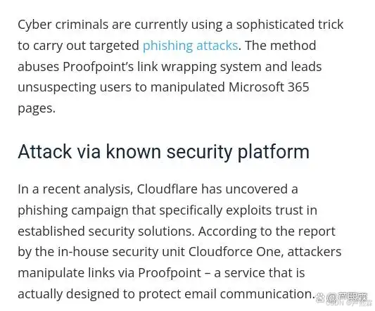 然而,安全机制本身亦可能成为攻击面。2025年7月,Cloudflare安全研究团队披露了一起利用Proofpoint链接封装机制实施钓鱼攻击的案例。攻击者并非绕过该机制,而是主动将其纳入攻击链,使恶意链接在形式上呈现为“经Proofpoint安全扫描”的可信资源。这种“以守为攻”的策略,颠覆了传统基于来源可信度的判断逻辑,对终端用户与自动化检测系统均构成严峻挑战。