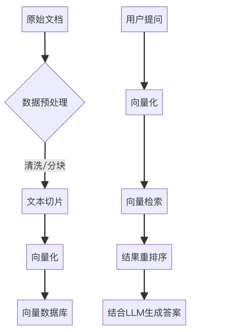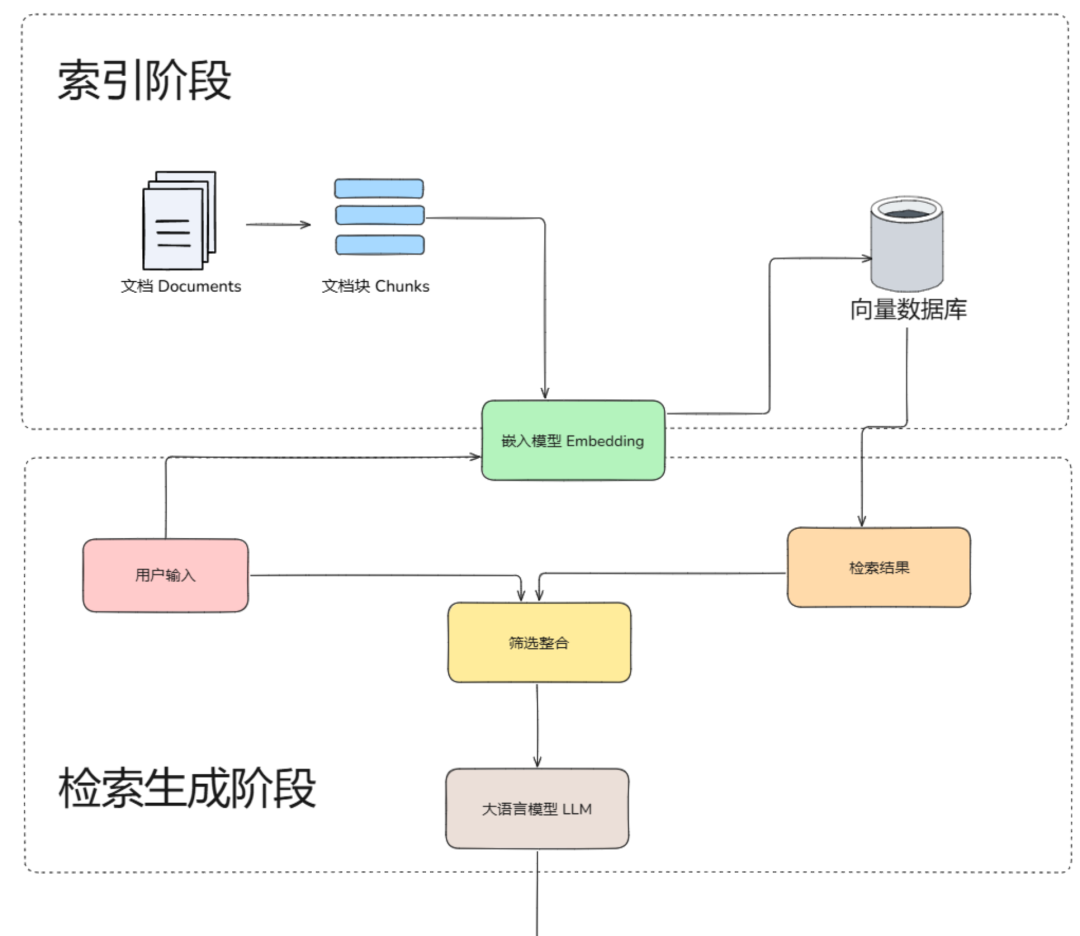 - 索引阶段:文档→分块→向量化→存入向量库(类似Java中"数据→DTO→数据库");