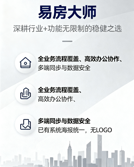 核心概况:深耕房产中介行业十六年,易房大师已服务近29 万家中介企业,主打 “功能无限制” 特性,适配从单人门店到连锁机构的全场景需求,搭配免费客服支持,使用体验省心高效。