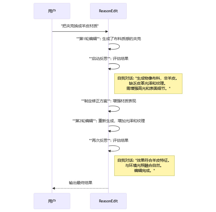 一旦评估发现问题,反思引擎会生成一份“修改意见”,并将其反馈给推理引擎,启动新一轮的编辑。这个过程可以迭代多次,直至达到满意的效果。