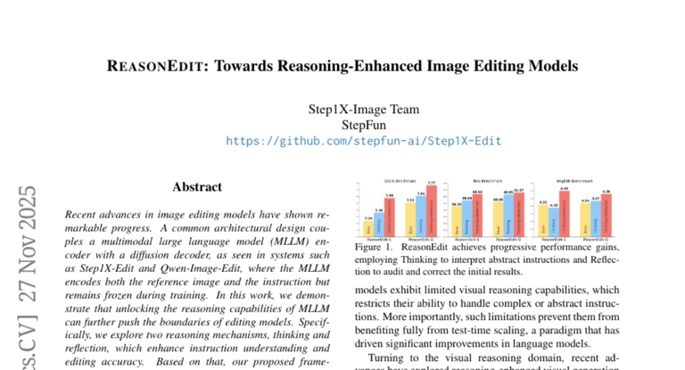 推动技术民主化:ReasonEdit是首个开源的推理增强型图像编辑模型。其代码和模型参数已在GitHub(