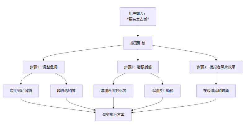 推理引擎是ReasonEdit的“规划大脑”。当接收到一个抽象指令时,它不会立即调用生成模型。相反,它会启动一个多步逻辑推理过程,将高层级的创意意图层层分解,直至形成一系列具体、可执行的底层操作指令。