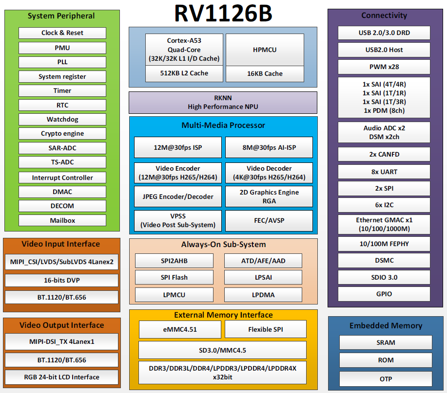 RV1126B是一款用于机器视觉应用的高性能视觉处理系统芯片,集成了4个Cortex-A53及独立的NEON协处理器并内置3TOPS NPU,支持4K@30fps的 H.264/H.265解码器,还支持4K@30fps的H.264/H.265编码器。