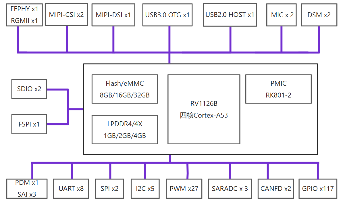 - 丰富的总线接口:1×GMAC、2×CAN FD、USB3.0、2×USB2.0、8×UART、27×PWM、3×SPI、5×I2C等;