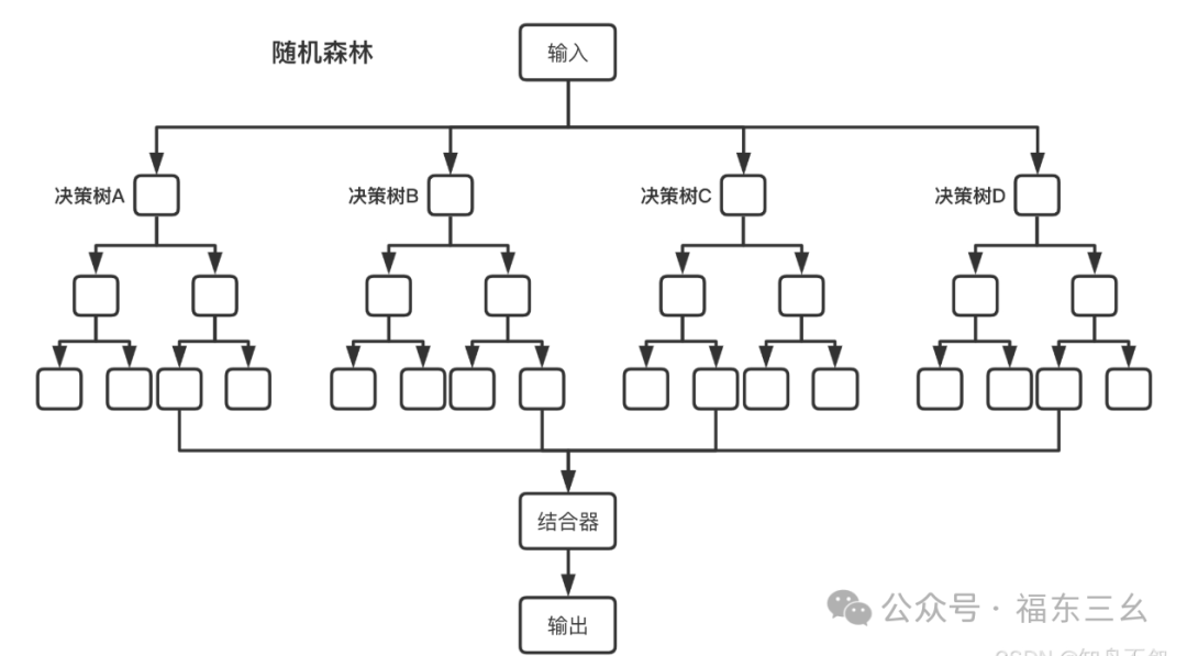 随机森林中有许多的分类树。我们要将一个输入样本进行分类,我们需要将输入样本输入到每棵树中进行分类。