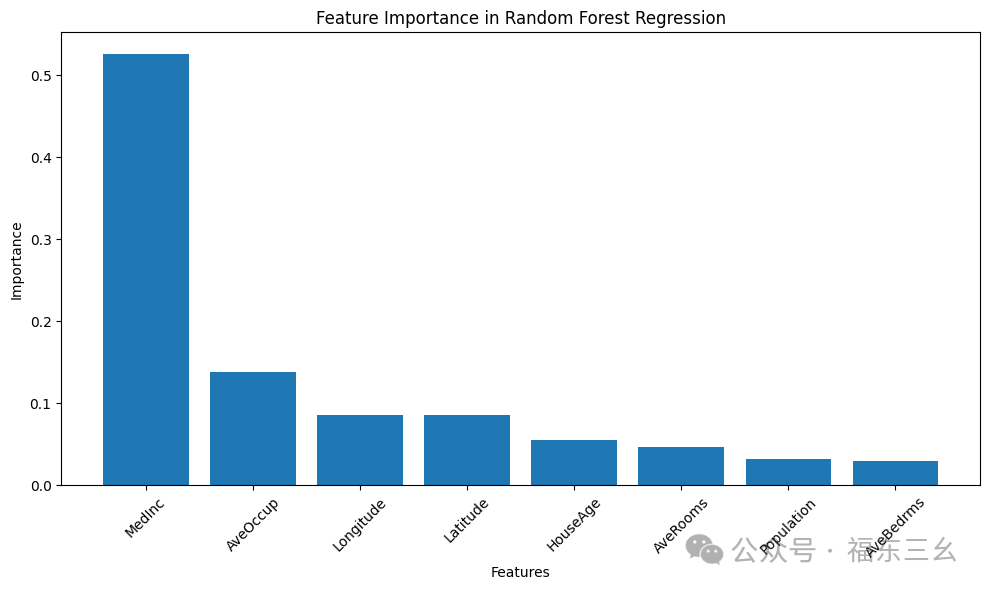 本文介绍了随机森林算法及其应用。随机森林是一种集成学习方法,通过构建多棵决策树并综合投票结果进行分类或回归。其优点包括抗过拟合、抗噪能力强、适合高维数据处理等,但存在参数复杂、计算速度慢等缺点。文章详细阐述了随机森林的生成规则和影响因素,并以加州房价预测为例展示了代码实现过程,包括数据准备、模型训练、性能评估和特征重要性可视化。结果表明随机森林在回归任务中表现良好,同时可通过调参进一步优化。该算法